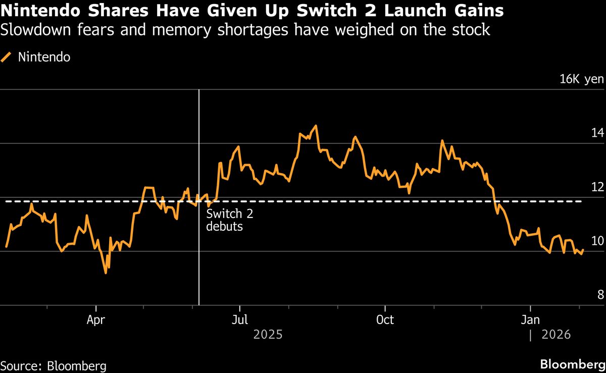 Nintendo Co.’s shares slid their most since April after the company reported disappointing earnings, revealing a big hit to margins while concerns grow about the impact of soaring memory chip prices in 2026.